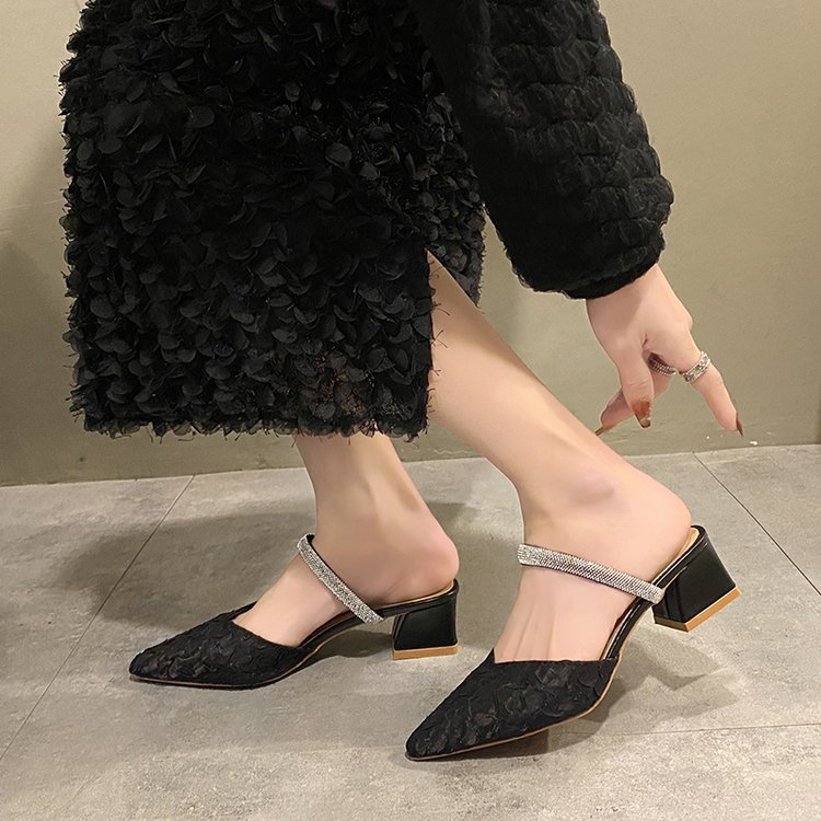 尖頭中跟法式 小高跟仙女配裙子涼拖 女夏水鉆一字帶涼鞋 包頭半拖鞋由
